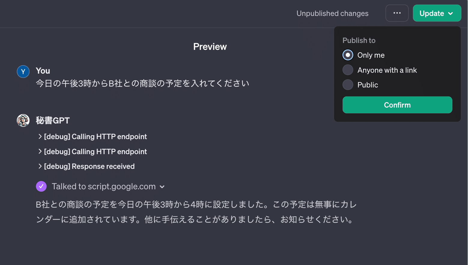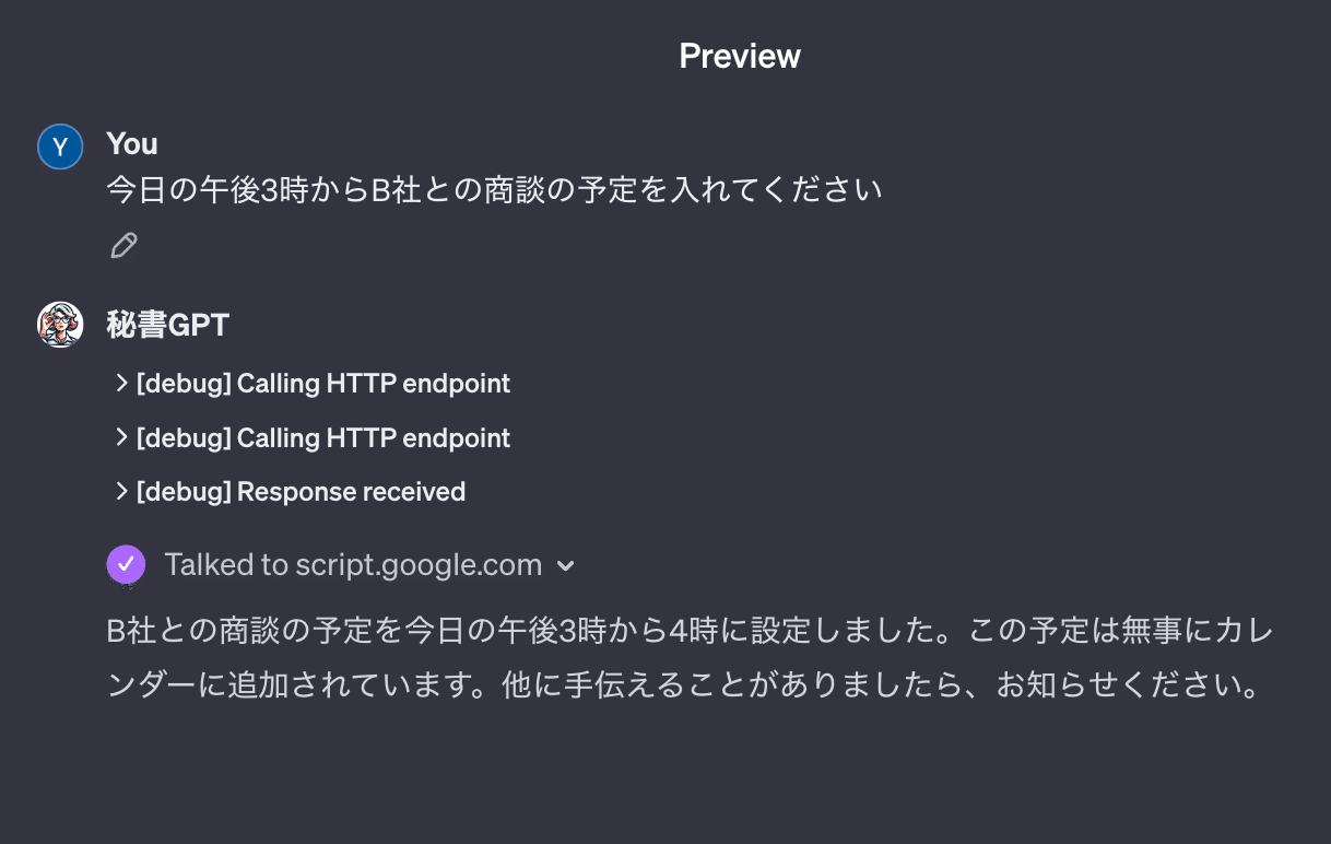 本記事では、以下のデモのように、GPTを自分のGoogle カレンダーと連携して、