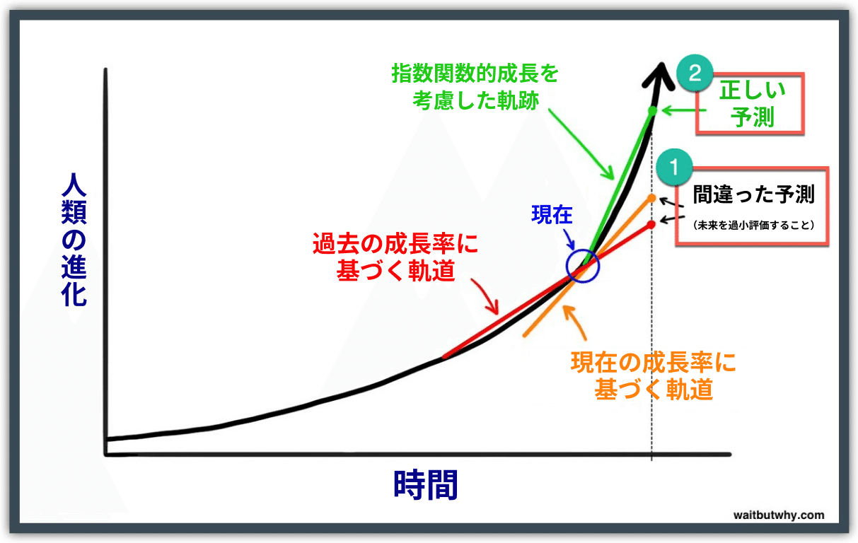1) 歴史に関しては、私たちは直線的に考えがちです。今後30年の進歩を想像するとき、私たちは過去30年の進歩を指標として、どれくらいのことが起こりそうかを見ています。21世紀にどの程度世界が変化するかを考えるとき、私たちは単に20世紀の進歩を2000年に加えるだけです。これは、1750年の人が1500年の人を連れてきて、同じ距離を先に進んだときに自分の頭が吹っ飛ぶのと同じくらい相手の頭を吹っ飛ばすことを期待したときと同じ間違いです。私たちにとって最も直感的なのは、指数関数的に考えるべきところを、直線的に考えることです。もし誰かがもっと賢明であれば、過去30年を見るのではなく、現在の進歩率を基に判断して、今後30年の進歩を予測するかもしれません。それはより正確でしょうが、それでもかなり間違っているでしょう。未来について正しく考えるためには、物事が現在のペースよりもずっと速いペースで動いていると想像する必要があります。