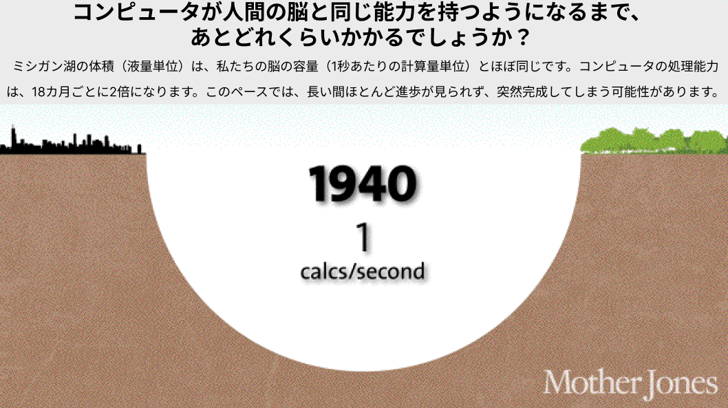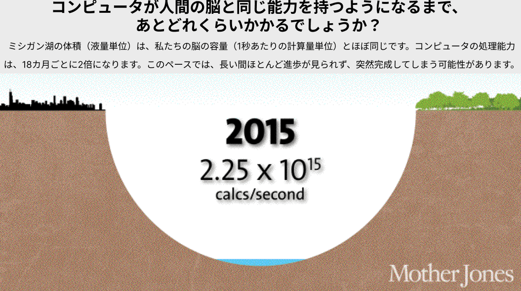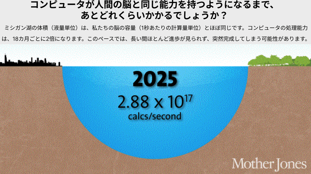 2015年現在、1,000ドルのコンピュータはマウスの脳を上回る性能を持ち、人間のレベルの千分の一程度に達しています。これは一見大したことないように思えるかもしれません。しかし、1985年には人間レベルの一兆分の一、1995年には一億分の一、2005年には百万分の一だったことを思い出してください。2015年に千分の一のレベルに達したということは、2025年までには手頃な価格で脳の能力に匹敵するコンピュータが登場するペースであることを意味しています。