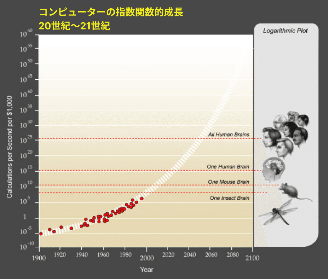 ムーアの法則は、世界の最大計算能力がおよそ2年ごとに倍増するという、歴史的に信頼できる法則です。つまり、コンピュータのハードウェアの進歩は、歴史を通じた人類の一般的な進歩と同様に指数関数的に成長するのです。これがカーツワイルのcps/1,000ドルの指標とどのように関連するかを見ると、現在は約10兆cps/1,000ドルで、このグラフの予測軌道とちょうど一致しています。