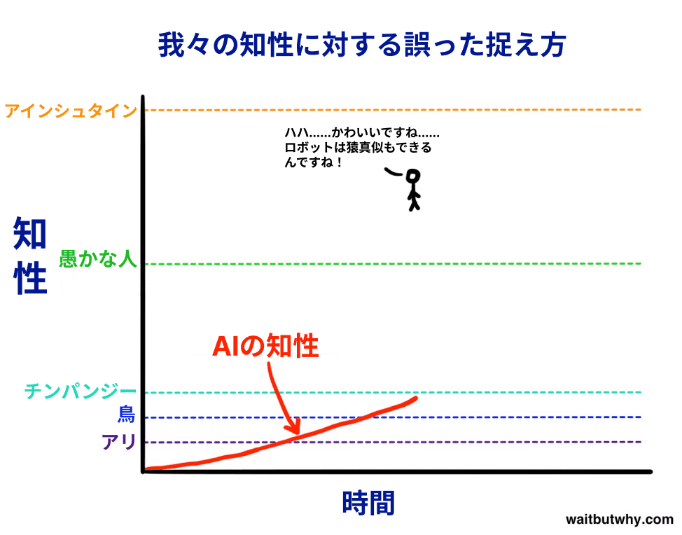 そして、AIの知性が私たちに向かって急上昇するにつれ、私たちは単にAIが動物としてより賢くなっていると捉えるでしょう。そして、AIが人類の最低レベルの知能、ニック・ボストロムが「村の馬鹿者」と呼ぶレベルに到達すると、私たちは「おやおや、まるで馬鹿な人間のようだ。可愛いね!」と思うはずです。しかし実際には、知性の大きなスペクトラムの中で、村の馬鹿者からアインシュタインまで、全ての人間はごく狭い範囲に収まっているのです。つまり、村の馬鹿者レベルに到達してAGIであると宣言された直後、AIは突如アインシュタインよりも賢くなり、私たちは何が起こったのかわからなくなってしまうのです。