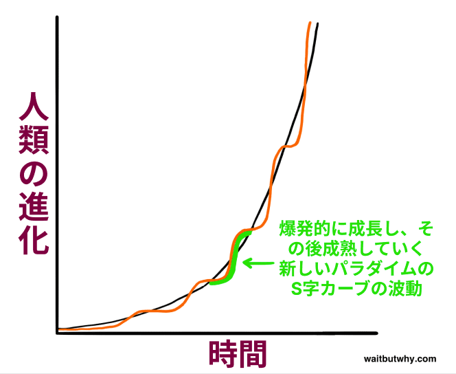 2)ごく最近の歴史の軌跡は、しばしば歪んだ物語を語ります。まず、急な指数関数曲線でも、ほんの一部分しか見ていないと、直線的に見えます。巨大な円の一部分を近くで見ると、ほとんど直線のように見えるのと同じです。次に、指数関数的な成長は完全にスムーズで一様ではありません。カーツワイルは、進歩は「S字カーブ」で起こると説明しています。