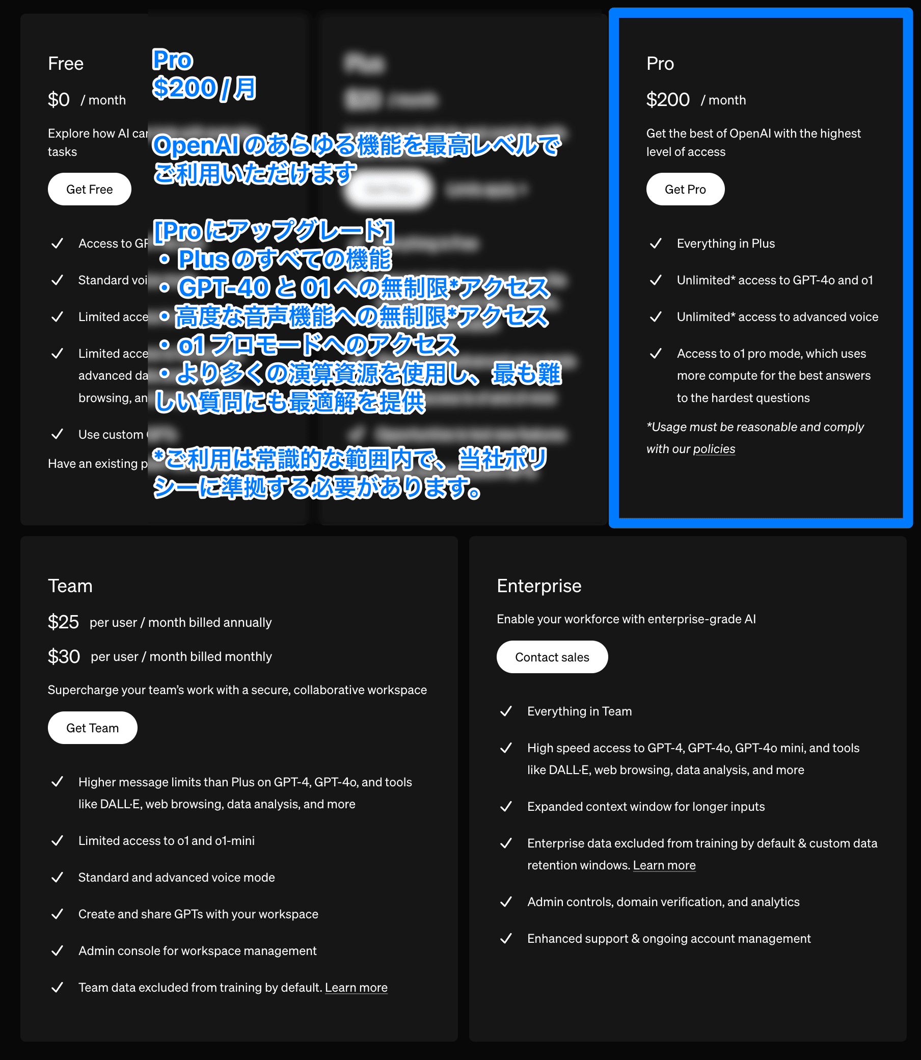 ChatGPT Proプラン(200ドル/月)の導入:o1やo1 pro modeへの無制限アクセス、Advanced Voice機能などを含む上位プラン。なお、o1自体はPlus/Teamプランでも利用可能です。