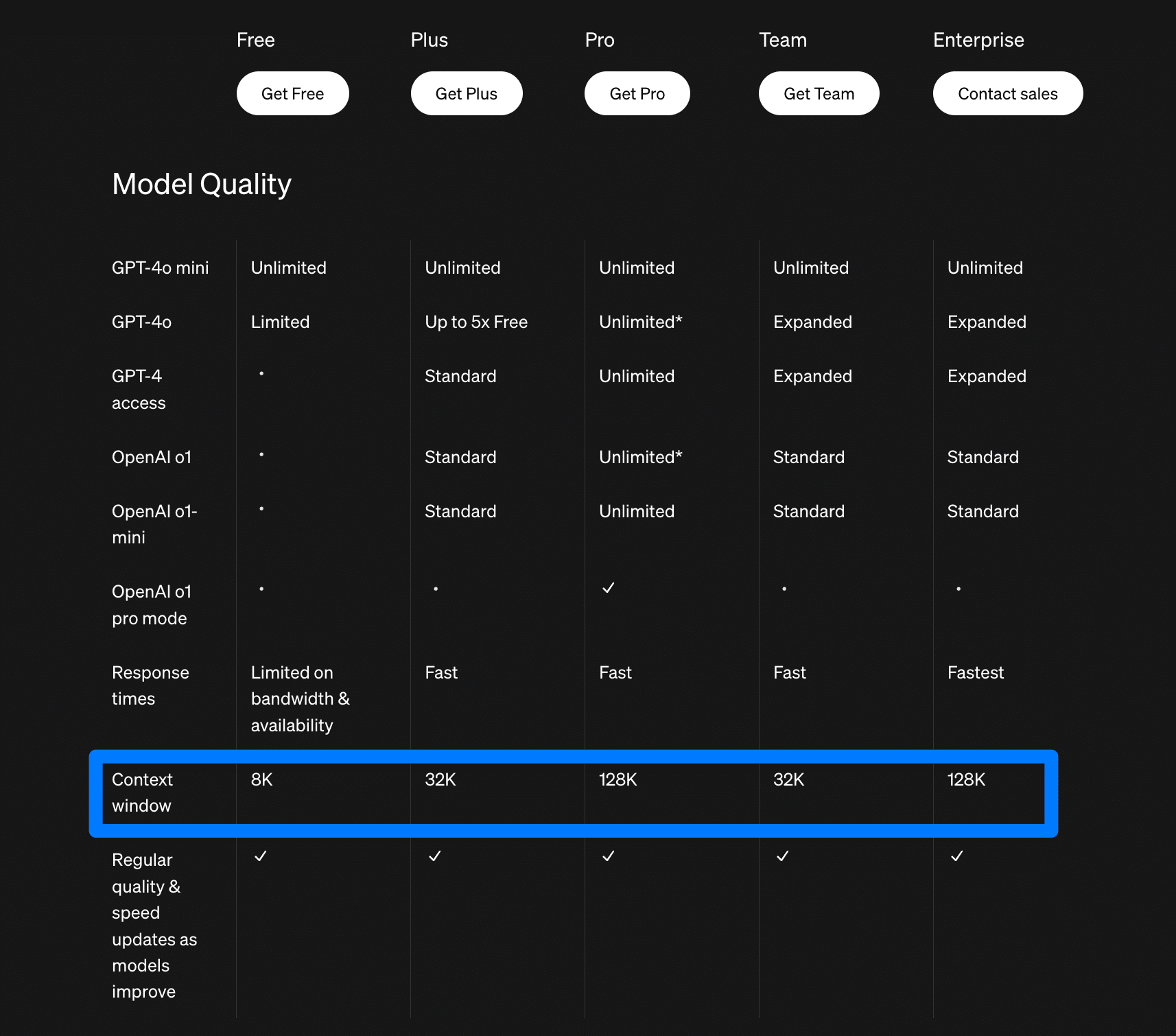 コンテキストウィンドウ拡張:Freeプランでは8Kトークン、Plus/Teamプランでは32Kトークン、Pro/Enterpriseプランでは128Kトークンまで利用可能となり、大規模コンテキストでのやり取りに対応します。