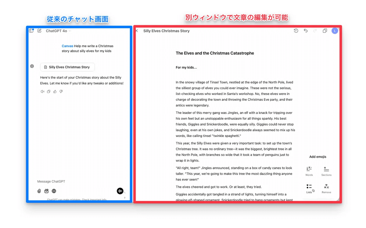 2024年12月11日、4日目の発表として、これまで有料プラン(Plus/Team)向けのベータ機能だった「Canvas」を、無料ユーザーを含む全ユーザーへ開放しました。