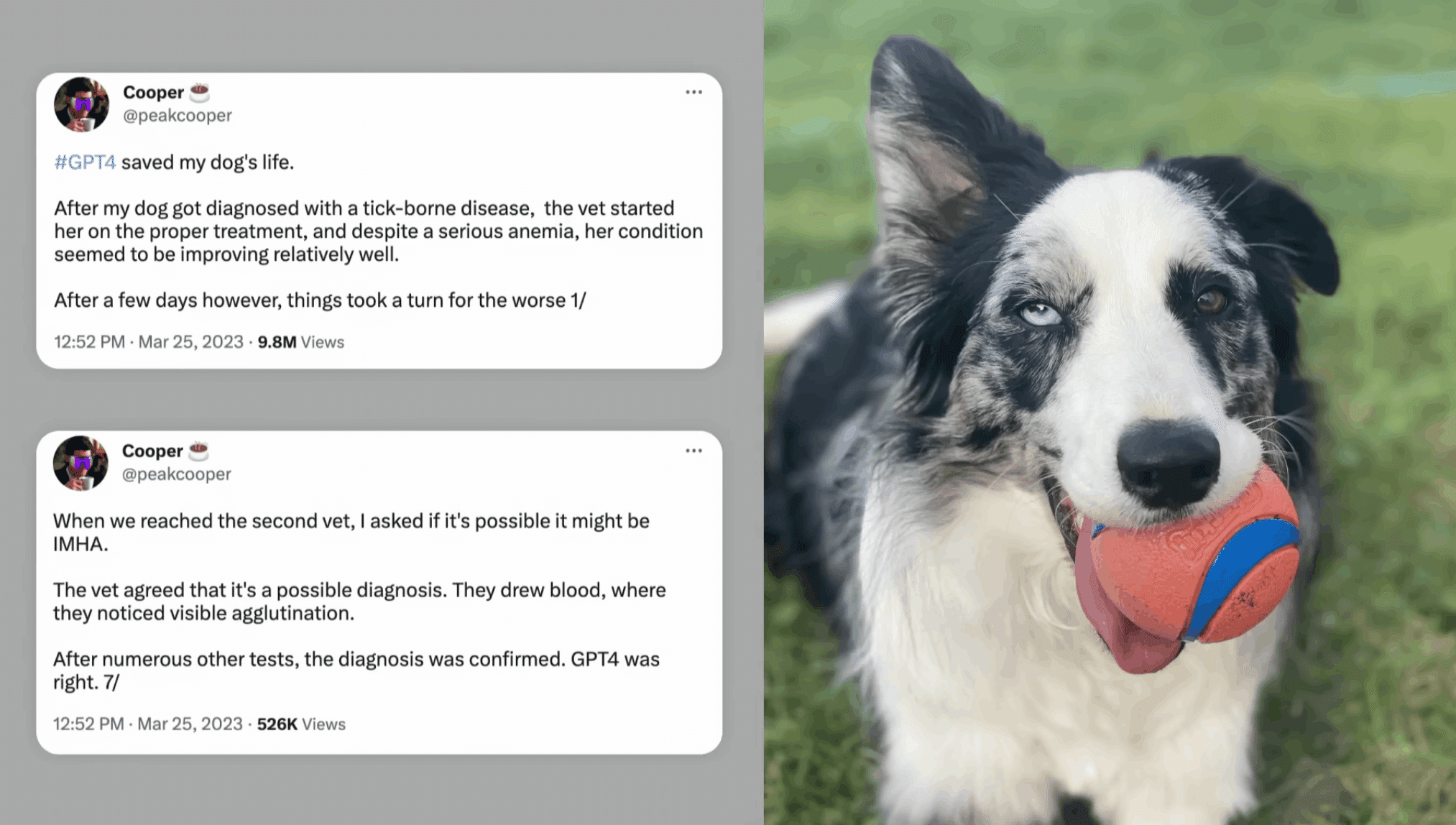 【2023年3月23日に「#GPT4 が私の犬の命を救った」というハッシュタグで投稿されたツイートの内容】
