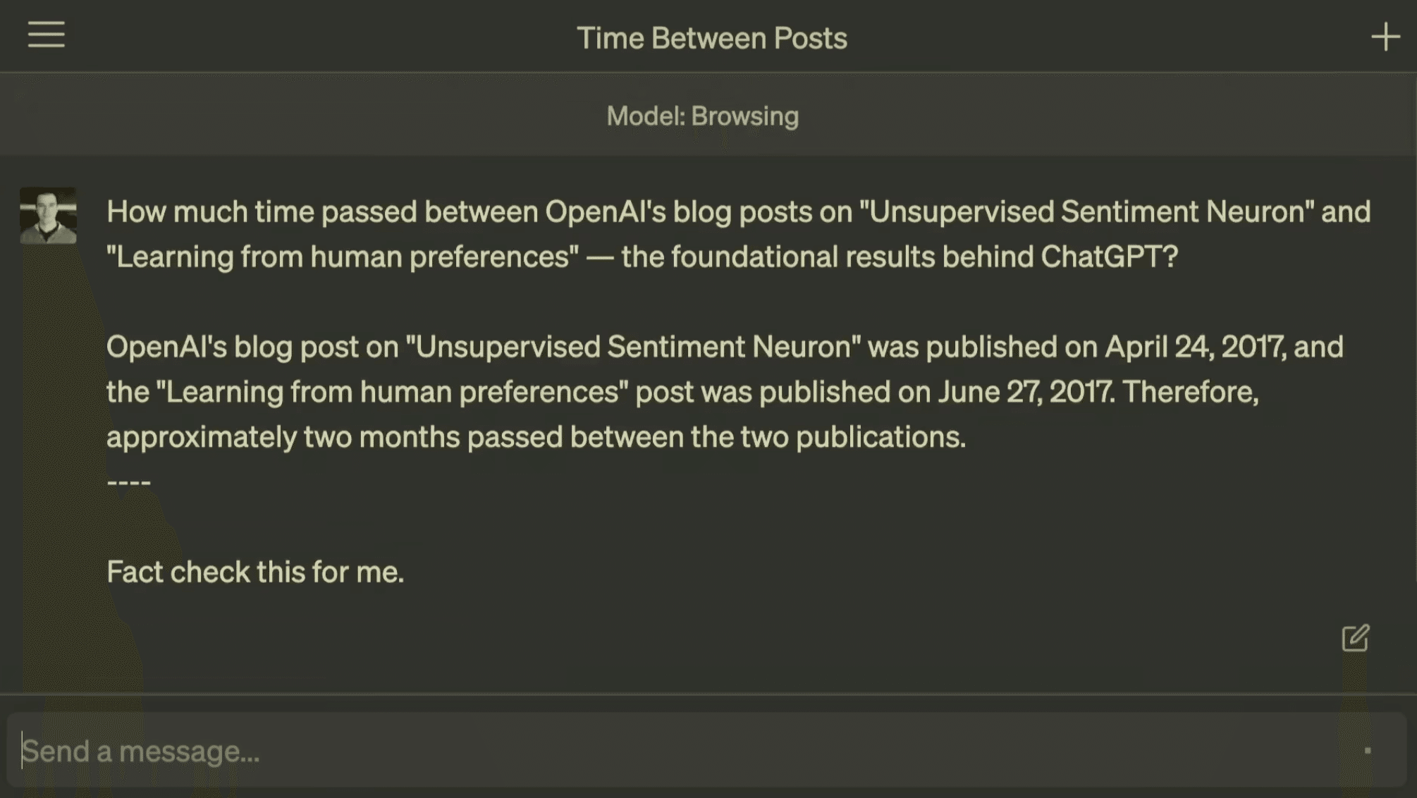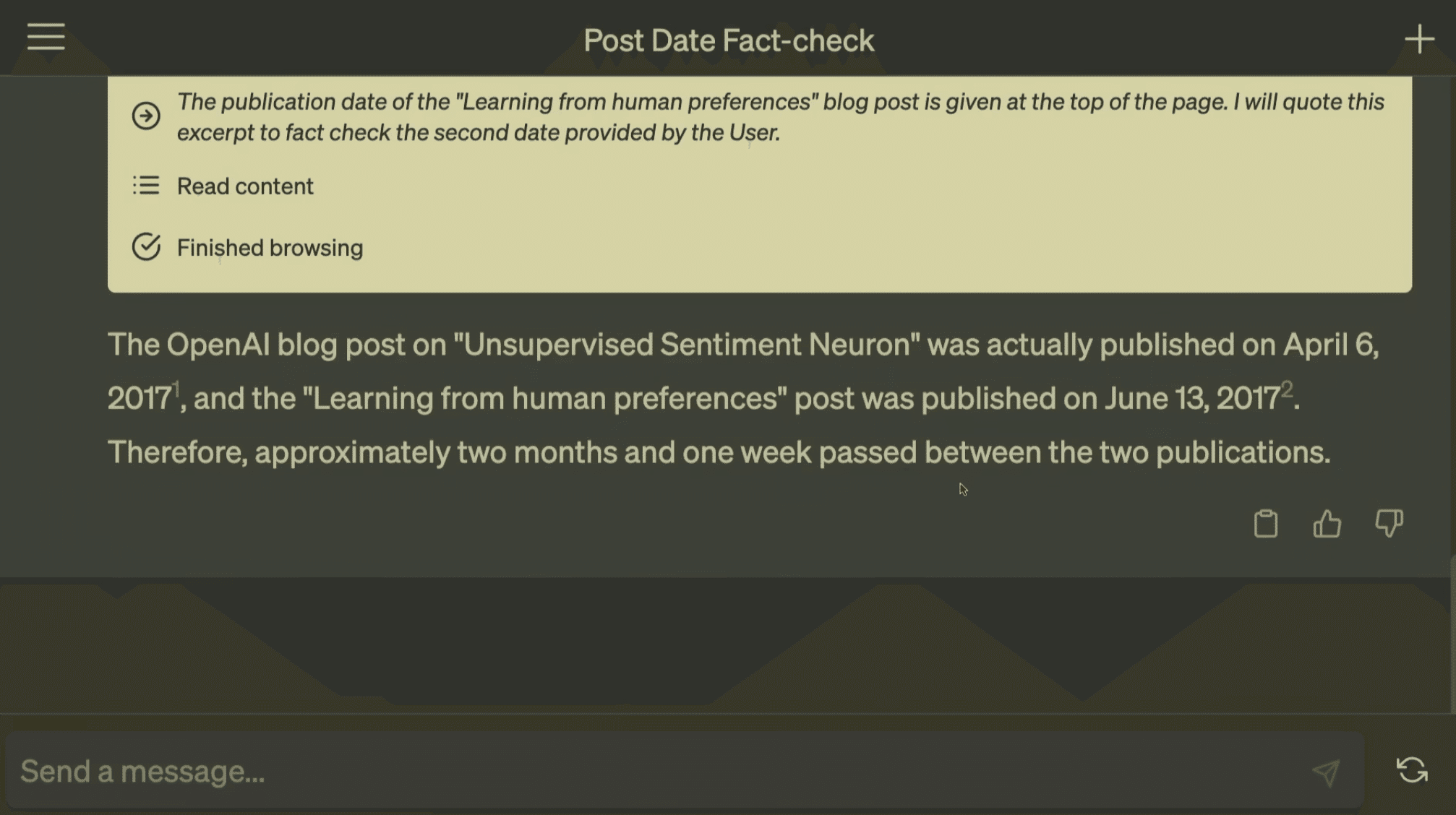 ChatGPTの回答:OpenAIのブログ記事「Unsupervised Sentiment Neuron」は実際に2017年4月6日に公開され、また「Learning from human preferences」の記事は2017年6月13日に公開されました。したがって、2つの記事の間にはおおよそ2か月と1週間の期間が経過しています。