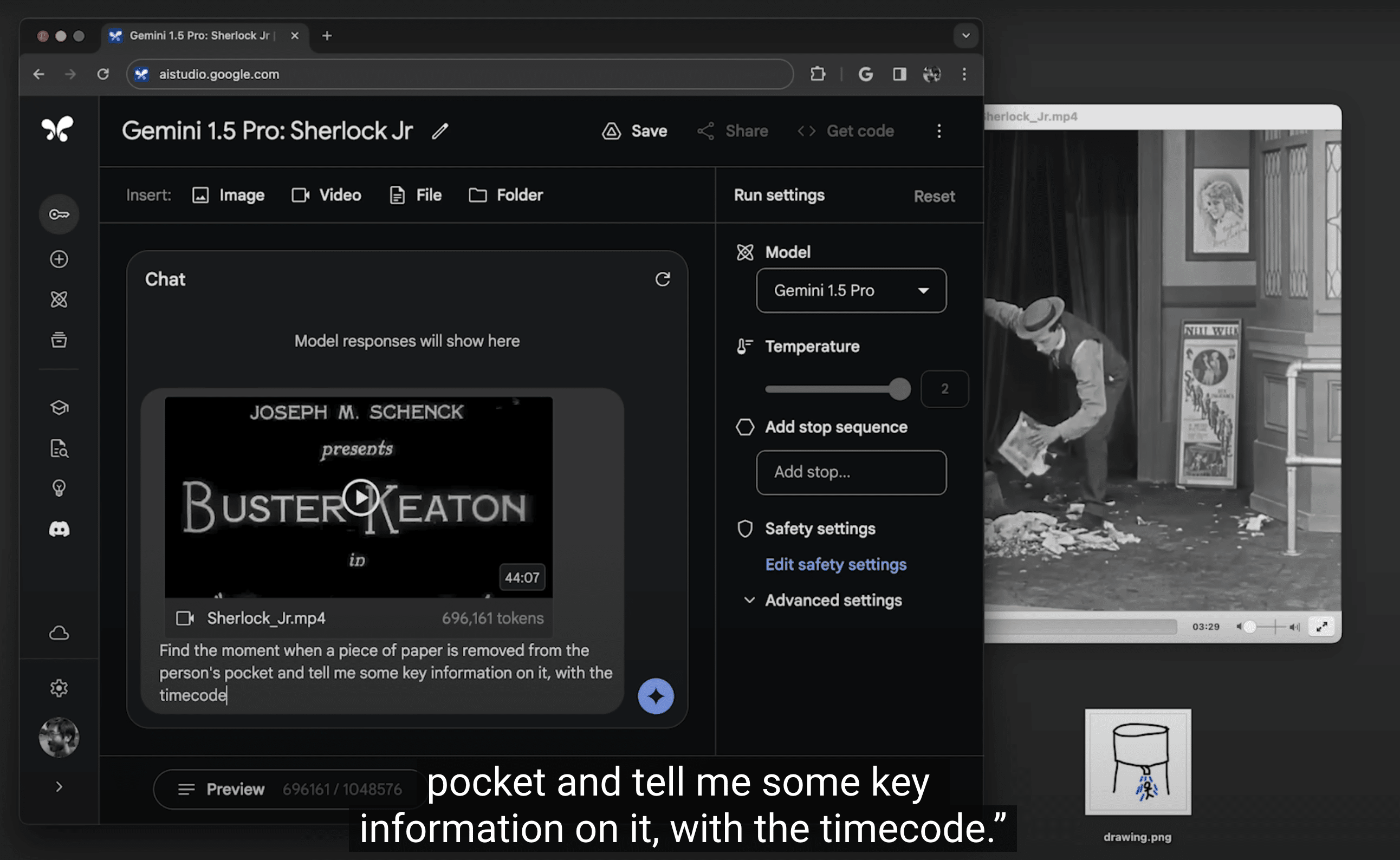 例えば、44分間のバスター・キートンの無声映画を与えると、プロットのポイントやイベントを正確に分析し、見落としやすい細部についても推論できるようになっています。