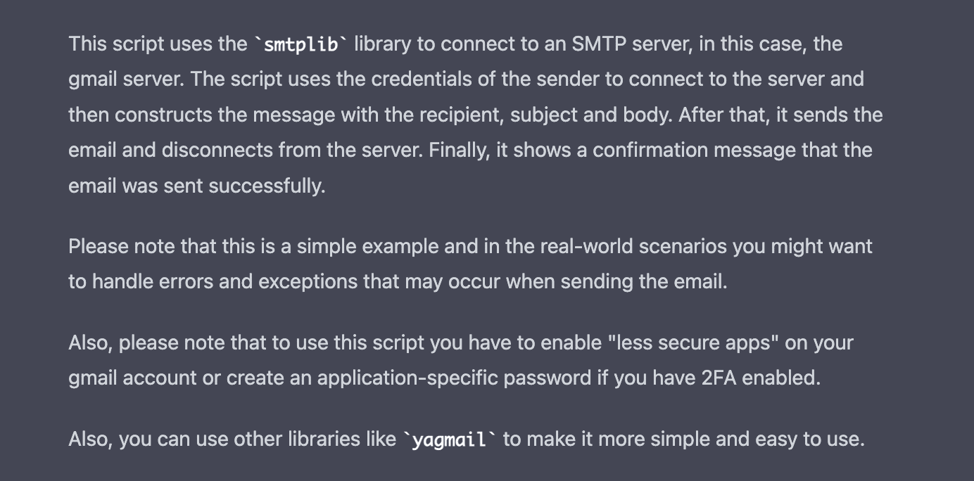 print(f"Email sent successfully to {recipient}!")5. まとめ