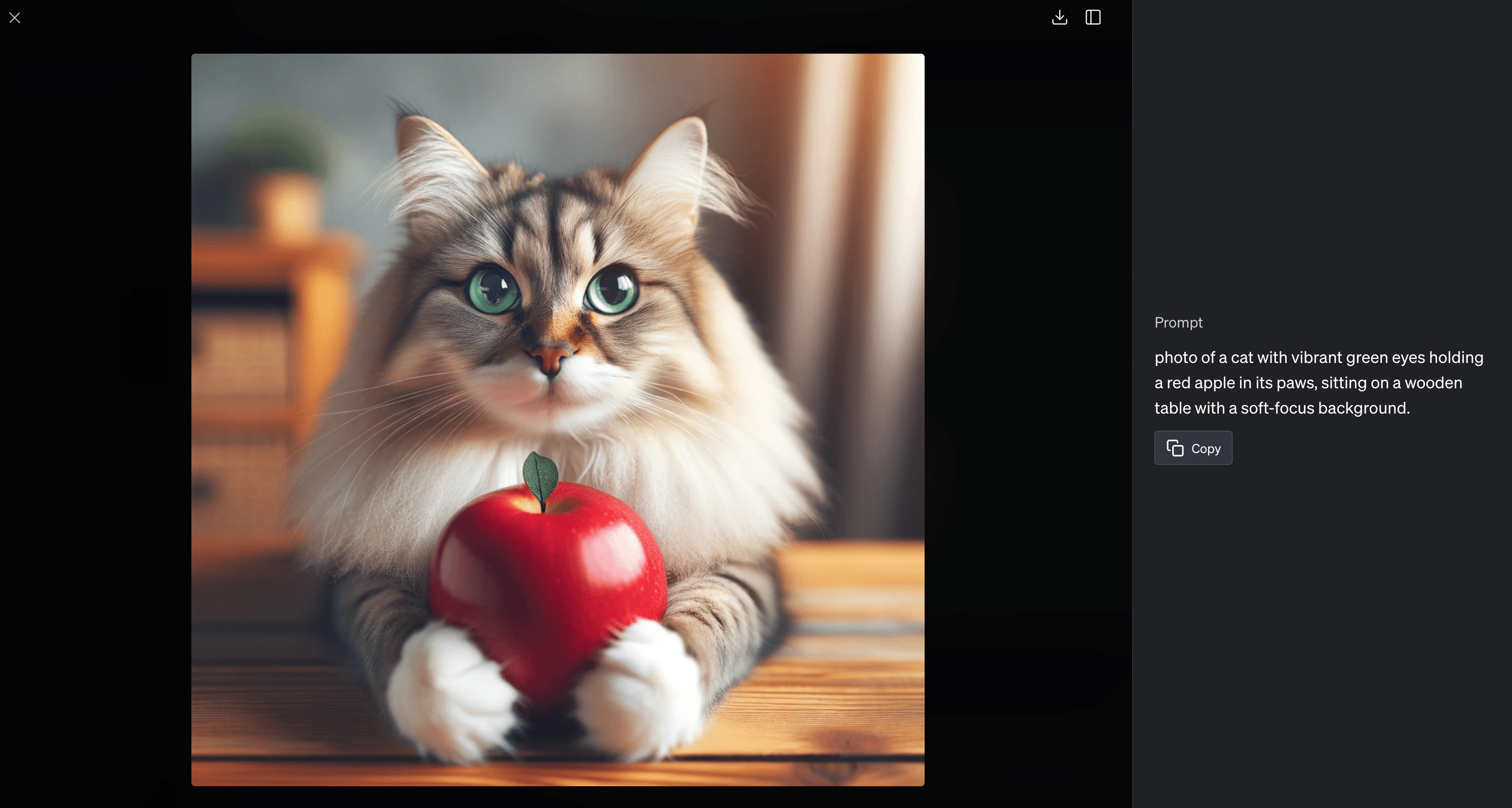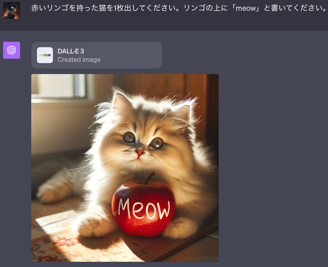 例えば、「赤いリンゴを持った猫を1枚出してください。リンゴの上に「meow」と書いてください。」と入力すると、以下のような画像が生成されます。