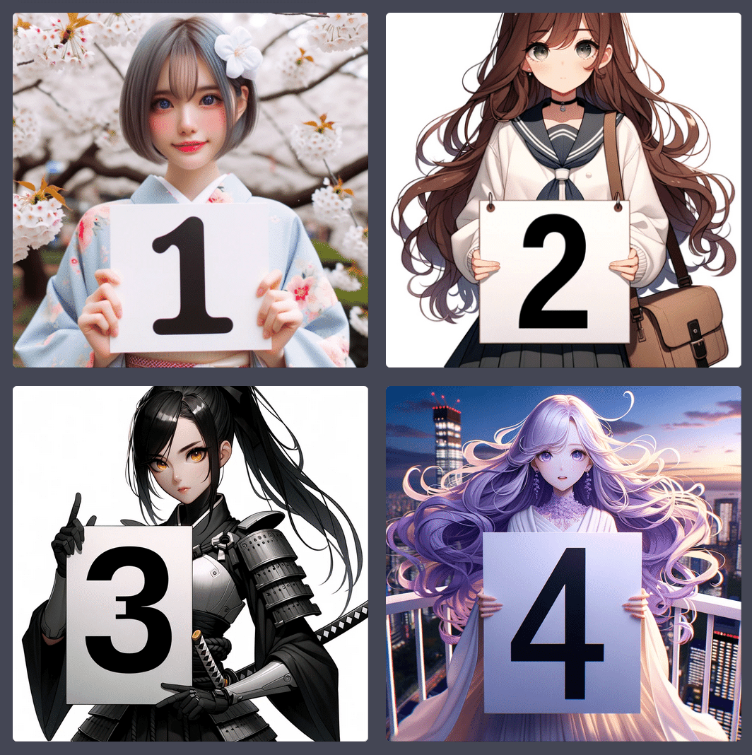 DALL·E 3 にフィードバックするために、まずは画像の配置を理解する必要があります。それぞれに番号があります。出された画像の、左上が1番、右上が2番、左下が3番、右下が4番です。もちろん番号ではなく、「左上」などの指定でもOKです。