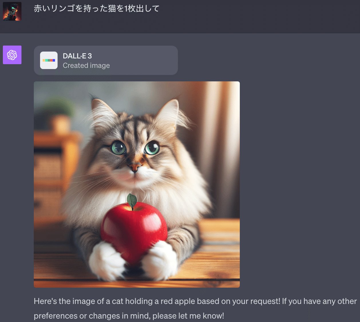 例えば、「赤いリンゴを持った猫を1枚出して」と入力すると、以下のような画像が生成されます。
