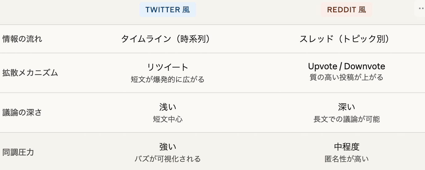 Twitter風とReddit風では、情報の広がり方が根本的に異なるからです。