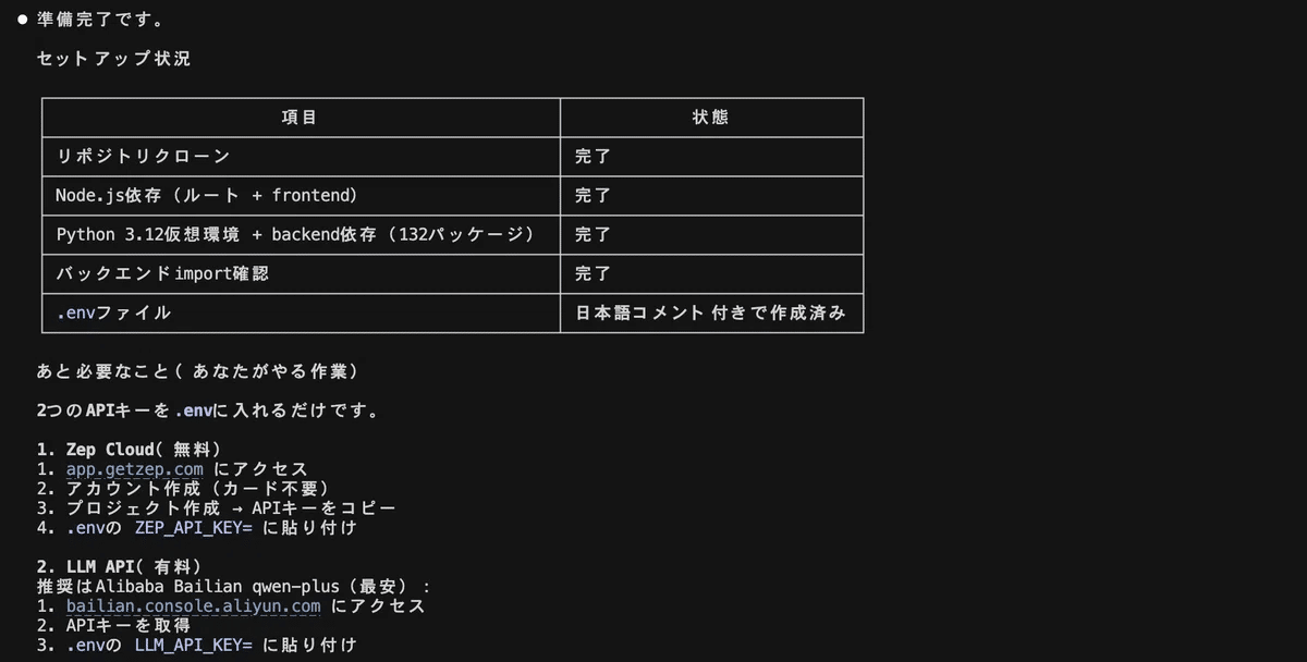 `.env`ファイルを開き、LLMのAPIキーとZep CloudのAPIキーを設定します。