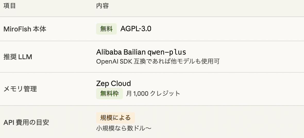 MiroFish自体は無料のオープンソースですが、LLMのAPIを使用するため、そのコストが発生します。