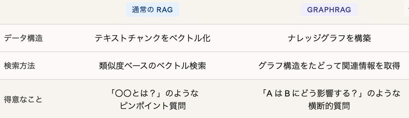 GraphRAGは、Microsoftが2024年2月に発表した技術です。通常のRAG(Retrieval-Augmented Generation)がテキストをチャンク(断片)に分割してベクトル検索するのに対し、GraphRAGはテキストからナレッジグラフ(エンティティと関係性の構造データ)を自動構築します。