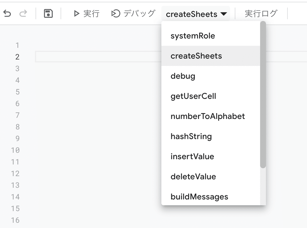 上記のコードを保存することで、以下の画像のように、上に関数のメニューが出てきます。こちらのメニューで、createSheets を選択して、実行をクリックします。