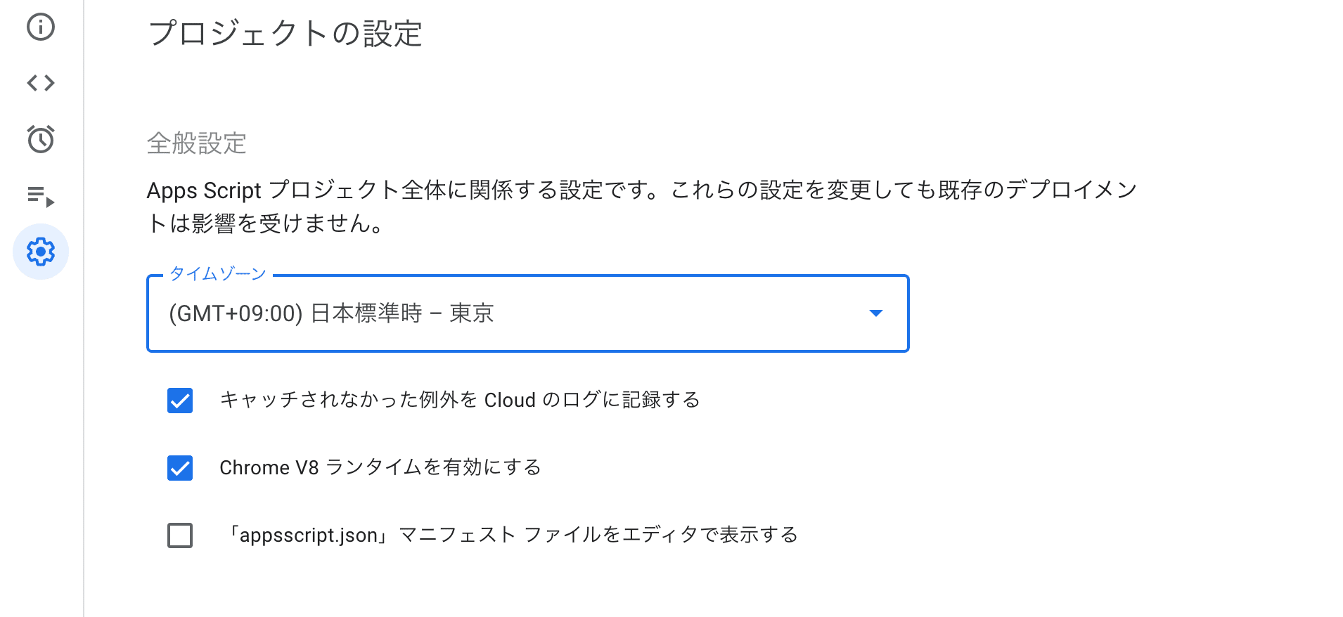 スクリプトプロパティは、セキュリティキーなどを安全に設定できる仕組みです。 OPENAI_APIKEY および LINE_ACCESS_TOKEN の2つのパラメータをスクリプトプロパティで管理します。まず、一番左の設定アイコンをクリックして、プロジェクトの設定画面に移動します。
