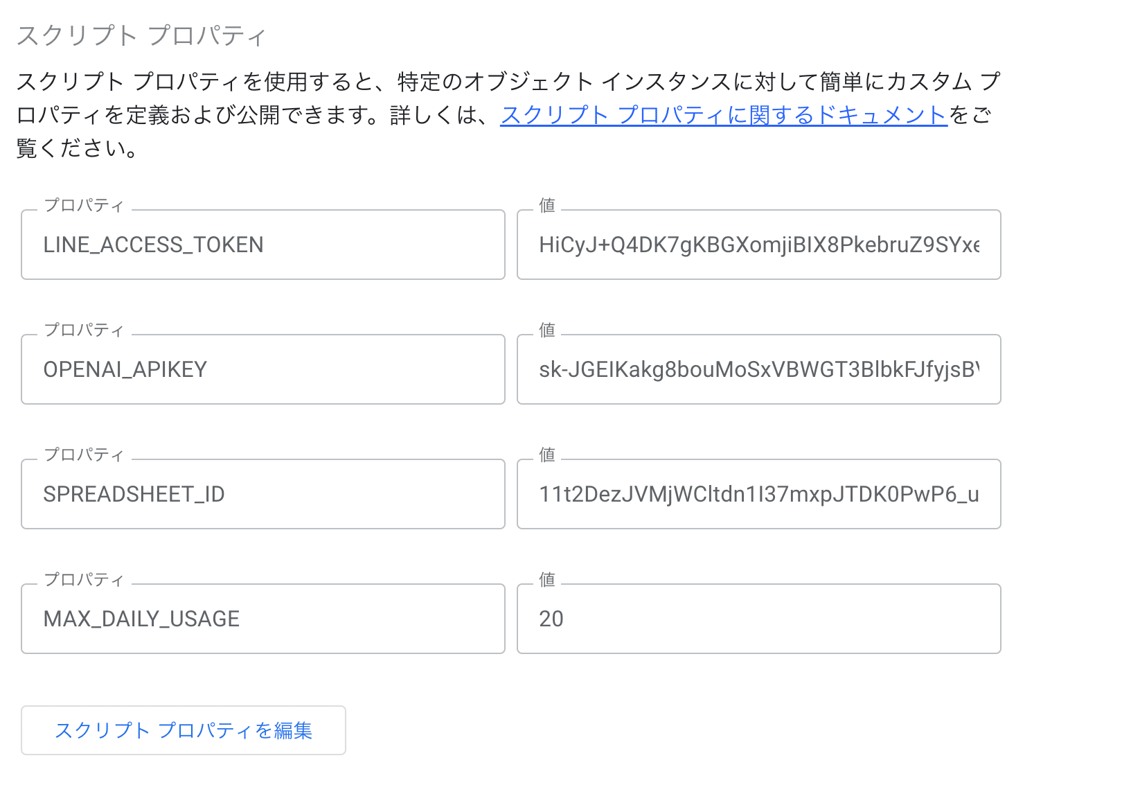 無料版では OPENAI_APIKEY と LINE_ACCESS_TOKEN のみスクリプトプロパティに設定していましたが、ここでは、 SPREADSHEET_ID, OPENAI_APIKEY, LINE_ACCESS_TOKEN , MAX_DAILY_USAGE, の4つのパラメータをスクリプトプロパティで管理します。MAX_DAILY_USAGEについてはユーザー毎の1日毎の使用回数制限ですが、もし制限が必要ない場合には、このパラメータは設定する必要はありません。
