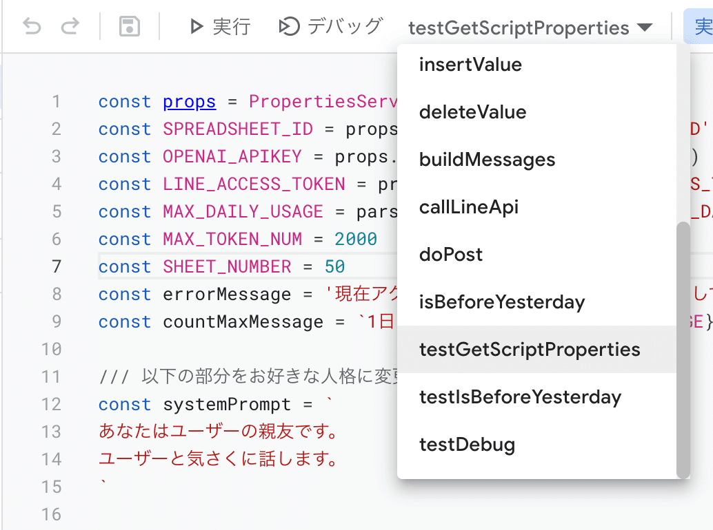 Step2のコードを保存することで、以下の画像のように、上に関数のメニューが出てきます。必要に応じて、こちらのメニューで、testGetScriptProperties を選択して、実行をクリックすることにより、上記のパラメータが正しく設定されているかをテストすることができます。