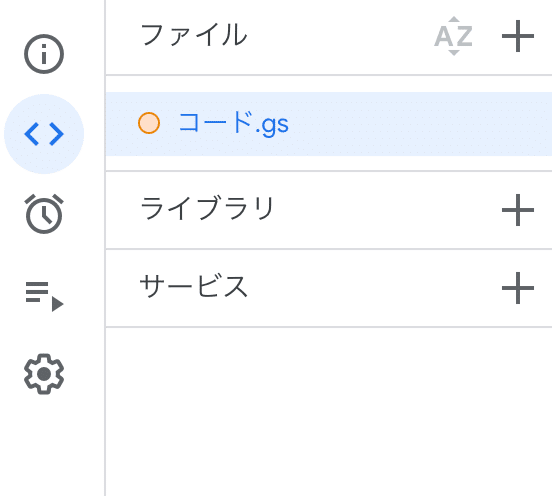 まず、GAS の左のメニューのライブラリのプラスボタンをクリックします。