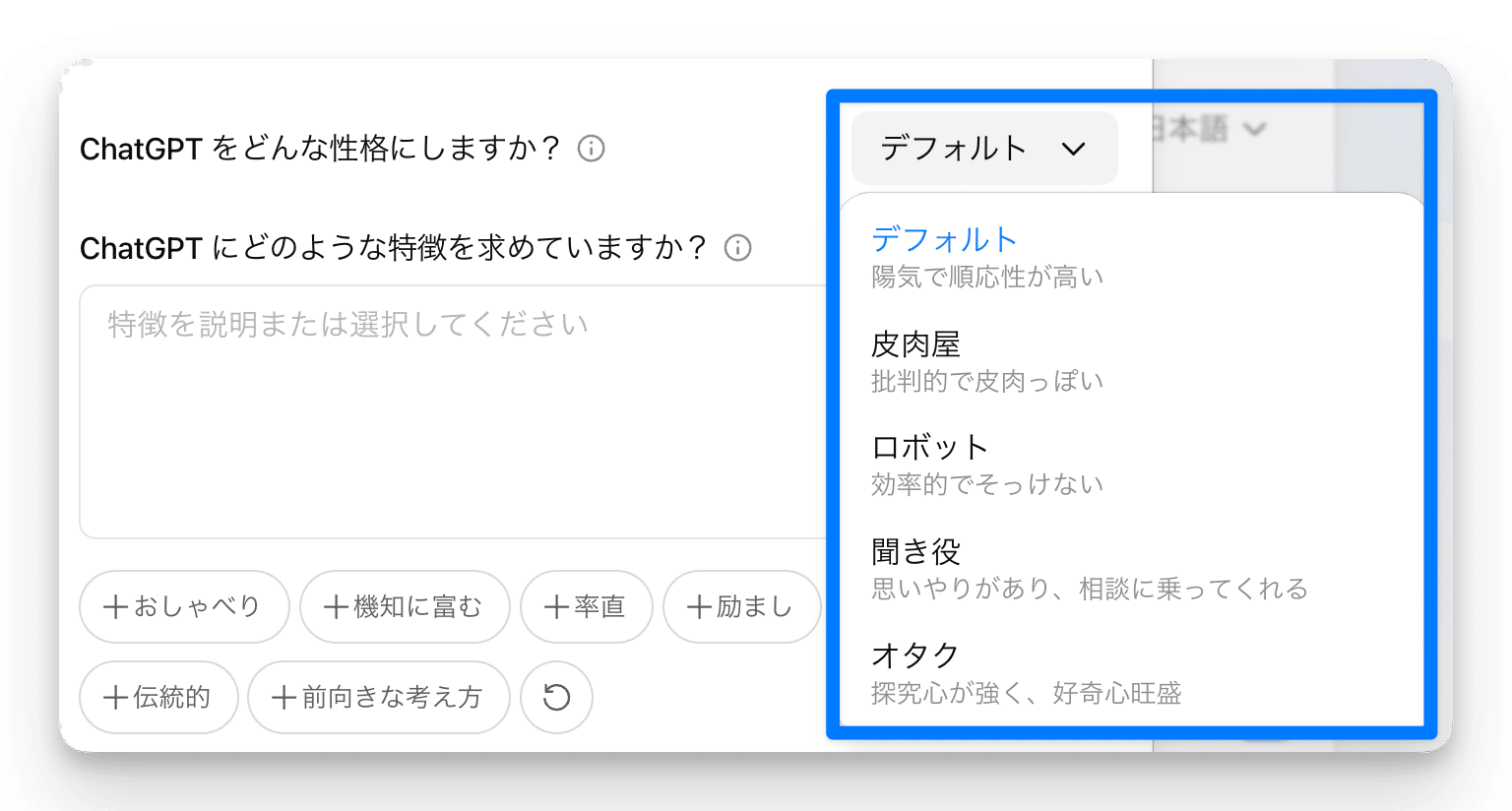 研究プレビューとして、モデルの性格を選べる機能が追加されました。以下の画像の通り、デフォルトに加え、皮肉屋やロボットといった個性的なキャラクターを選択可能です。