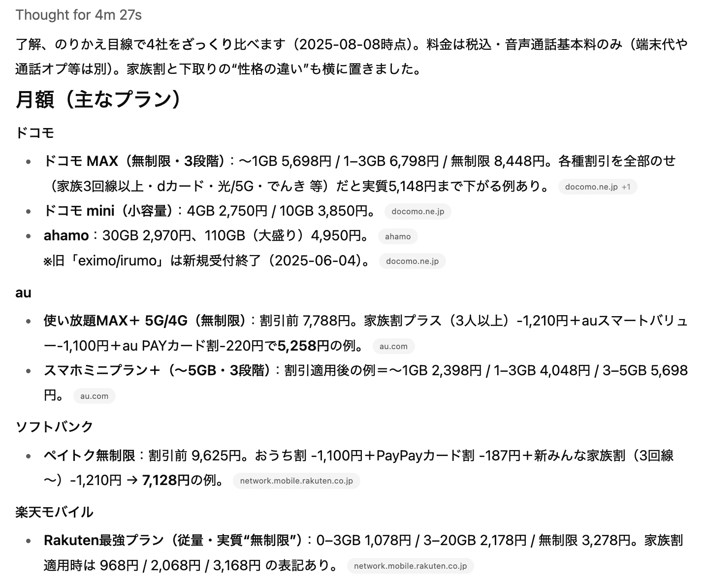 4分ほどかかっていますが、総じてリサーチと要約の質は高かったです。