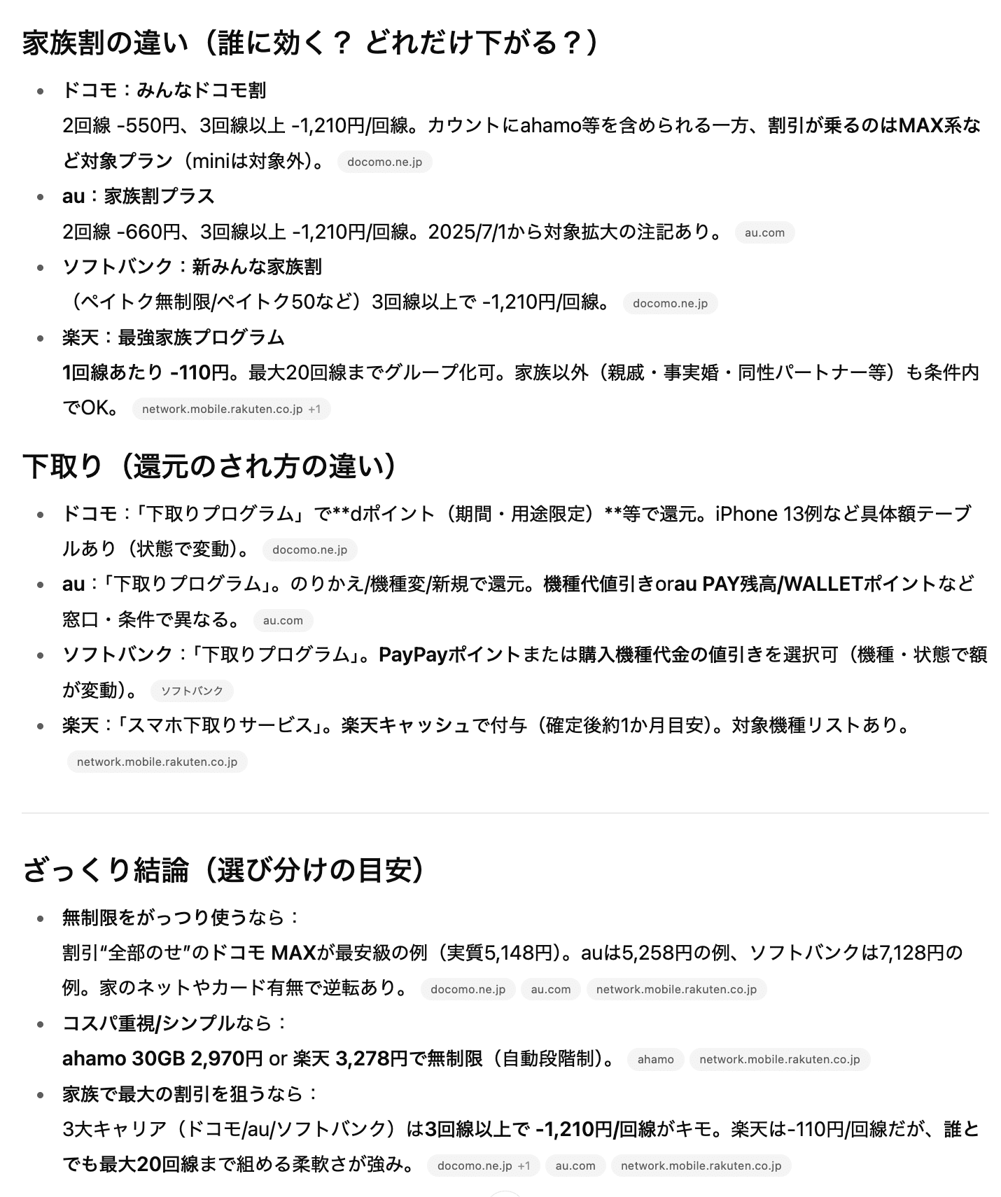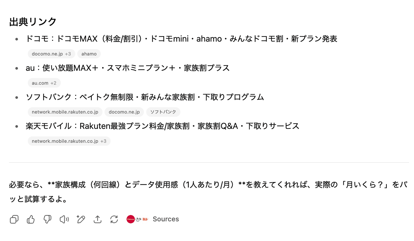 この出力では、料金、家族割、下取りの要点など必要な情報がしっかりまとまっています。誤情報は見当たらず、出典が明確なためハルシネーションの兆候も少なそうです。