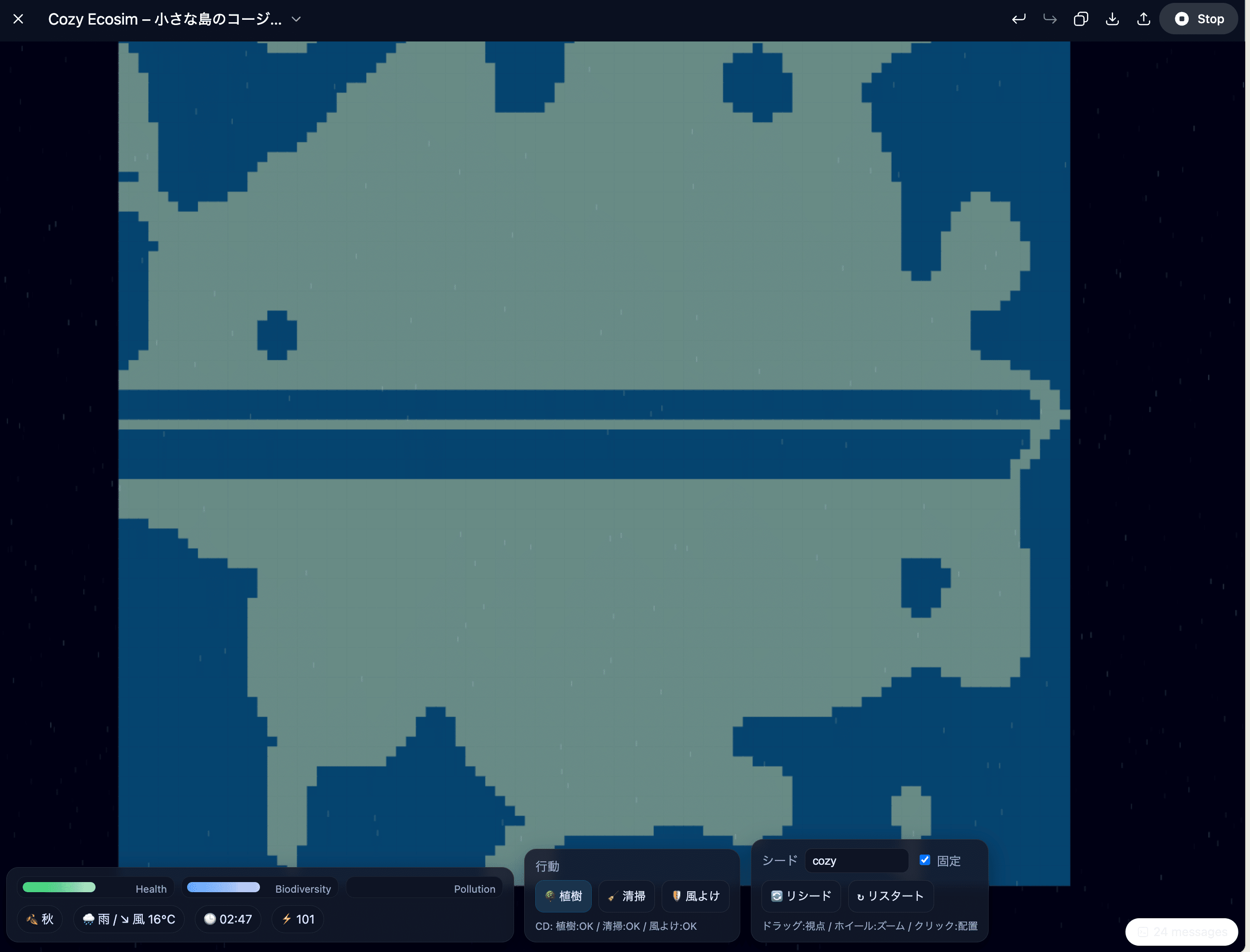 対してClaudeは低ポリ3Dの島に状態パネルや行動ボタンがしっかり連動し、介入すると指標が素直に変化します。こちらもClaudeが一歩リードという印象です。