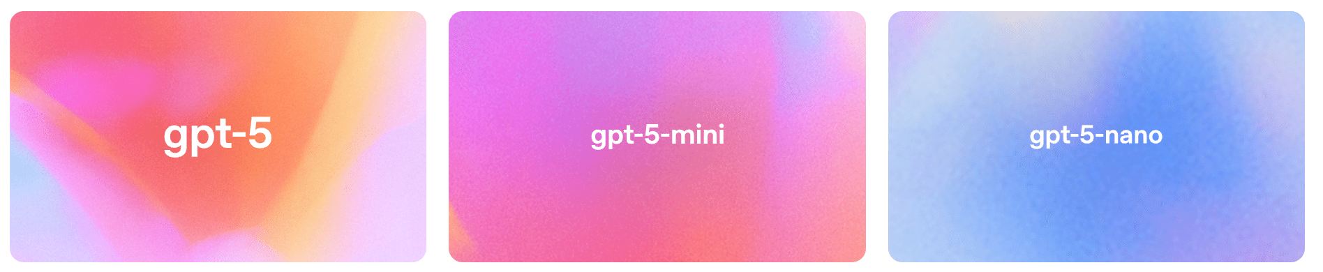 gpt-5 / gpt-5-mini / gpt-5-nano。高性能・汎用はgpt-5、速度/コスト重視はmini、大量処理向けの単純処理はnano。