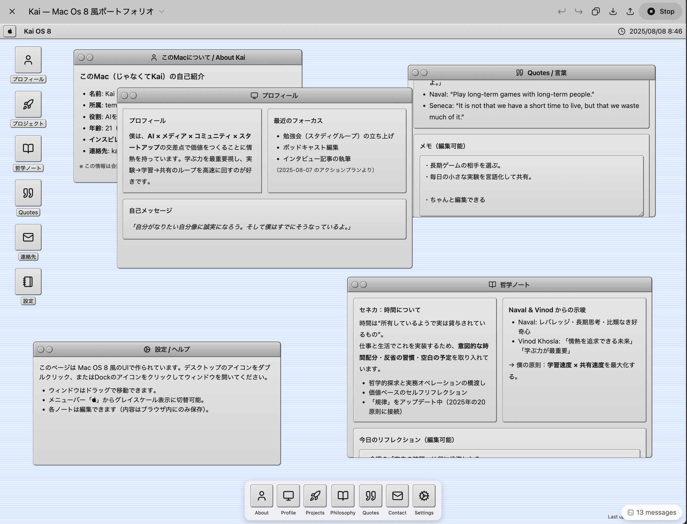 MacOS 8風のデザインを使って、インタラクティブに操作できる自己紹介Webページを作りたいです。基本情報は、あなたが僕について知っていることをすべて入れて構いません。Canvasでコーディングしていただき、デザインは渾身のものを出してもらえると嬉しいです。