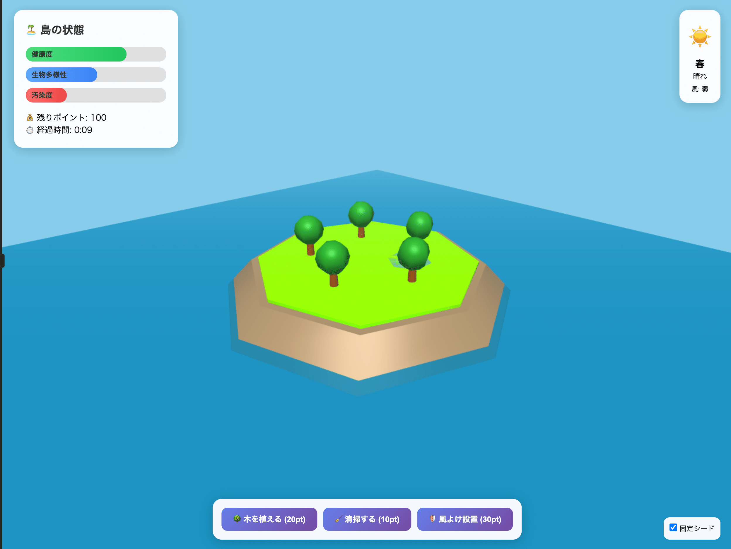 - プレイヤーの行動:木を植える/清掃する/風よけを置く(各行動はコストとクールダウン)