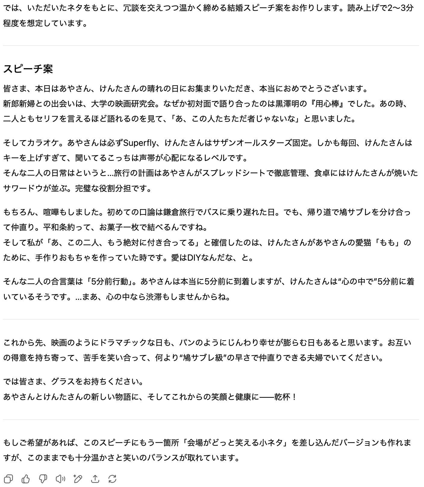 友人あやとけんたへの結婚スピーチを書いていただけますか?冗談を含めつつ温かいトーンで。2〜3分程度。
