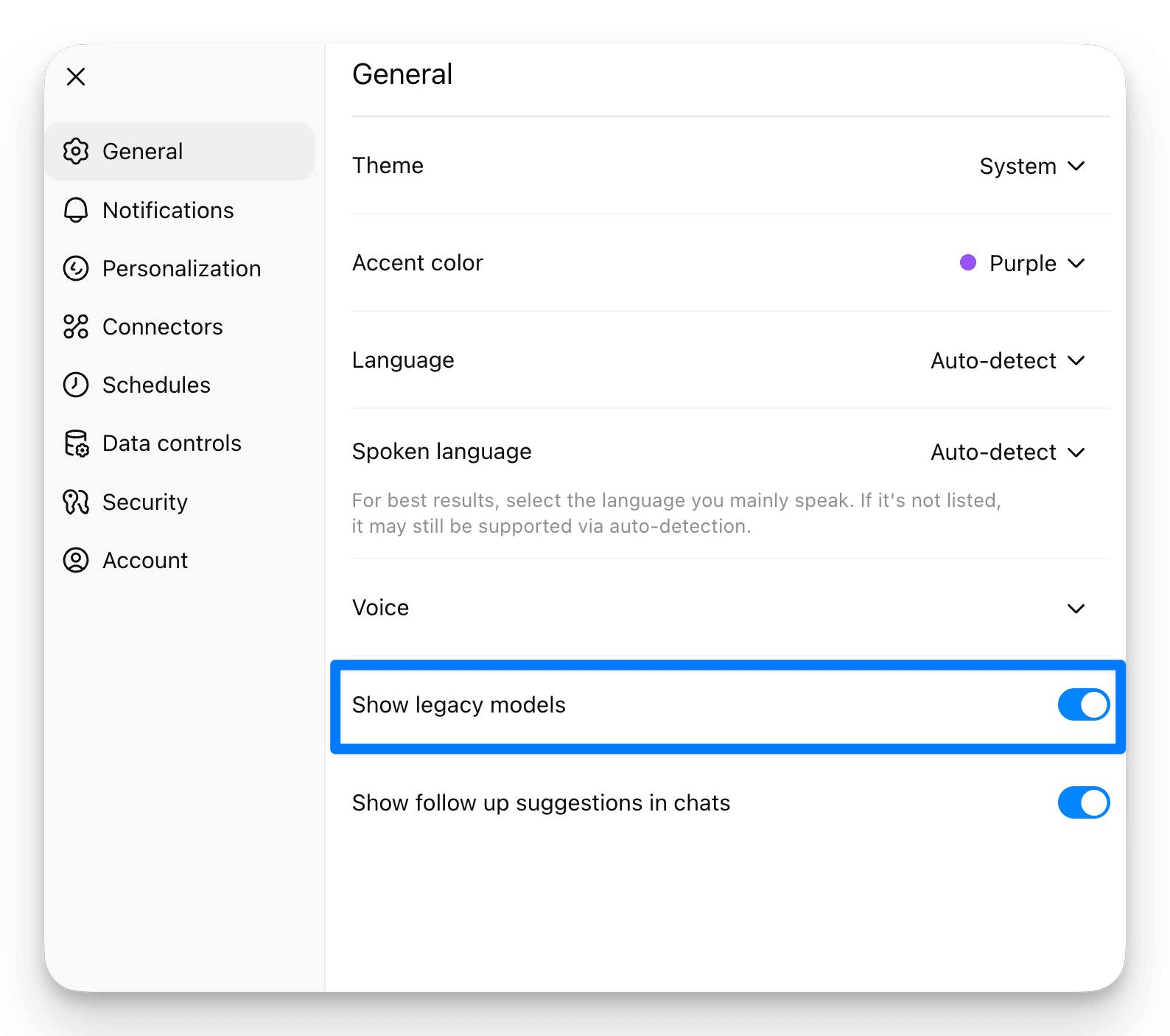 なお、現状は設定の`General`にある`Show legacy models`をオンにすると、o3や4oなどの旧モデルも再表示されます。