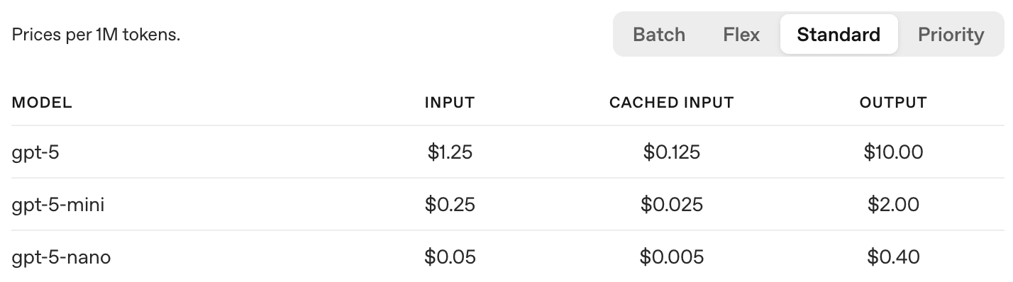 価格: Standardの入力はgpt‑5: $1.25/1M、gpt‑5‑mini: $0.25、gpt‑5‑nano: $0.05。