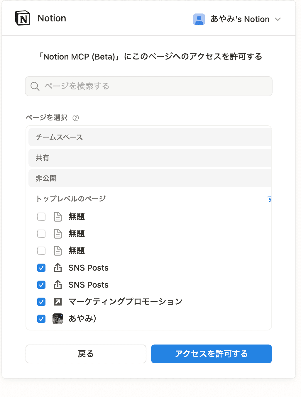 この画面で、Notion MCPがアクセスできるページを選択します。