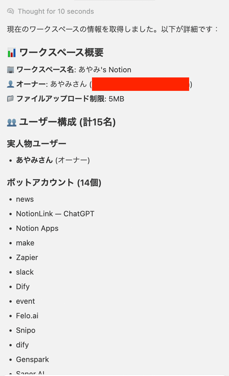 @notion 現在のワークスペースの情報を取得してください正常に接続されていれば、Notionワークスペースの情報が表示されます。