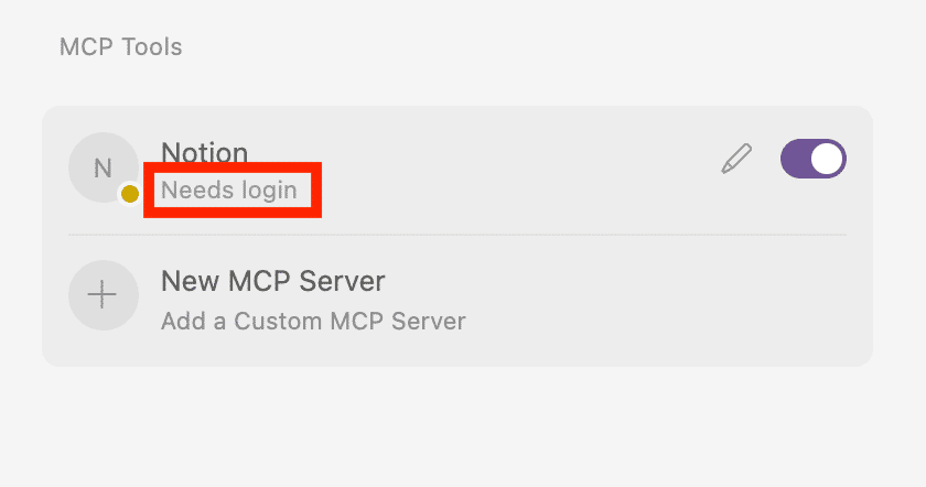 MCP Toolsの箇所にNotionが追加されるので、「Needs login」をクリックして、ログインします。
