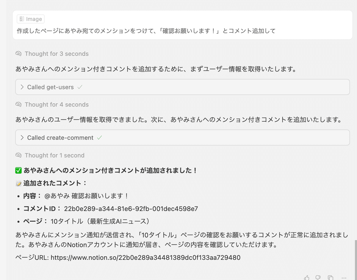 Notion MCP経由で、Cusorからコメントを追加することもできます。
