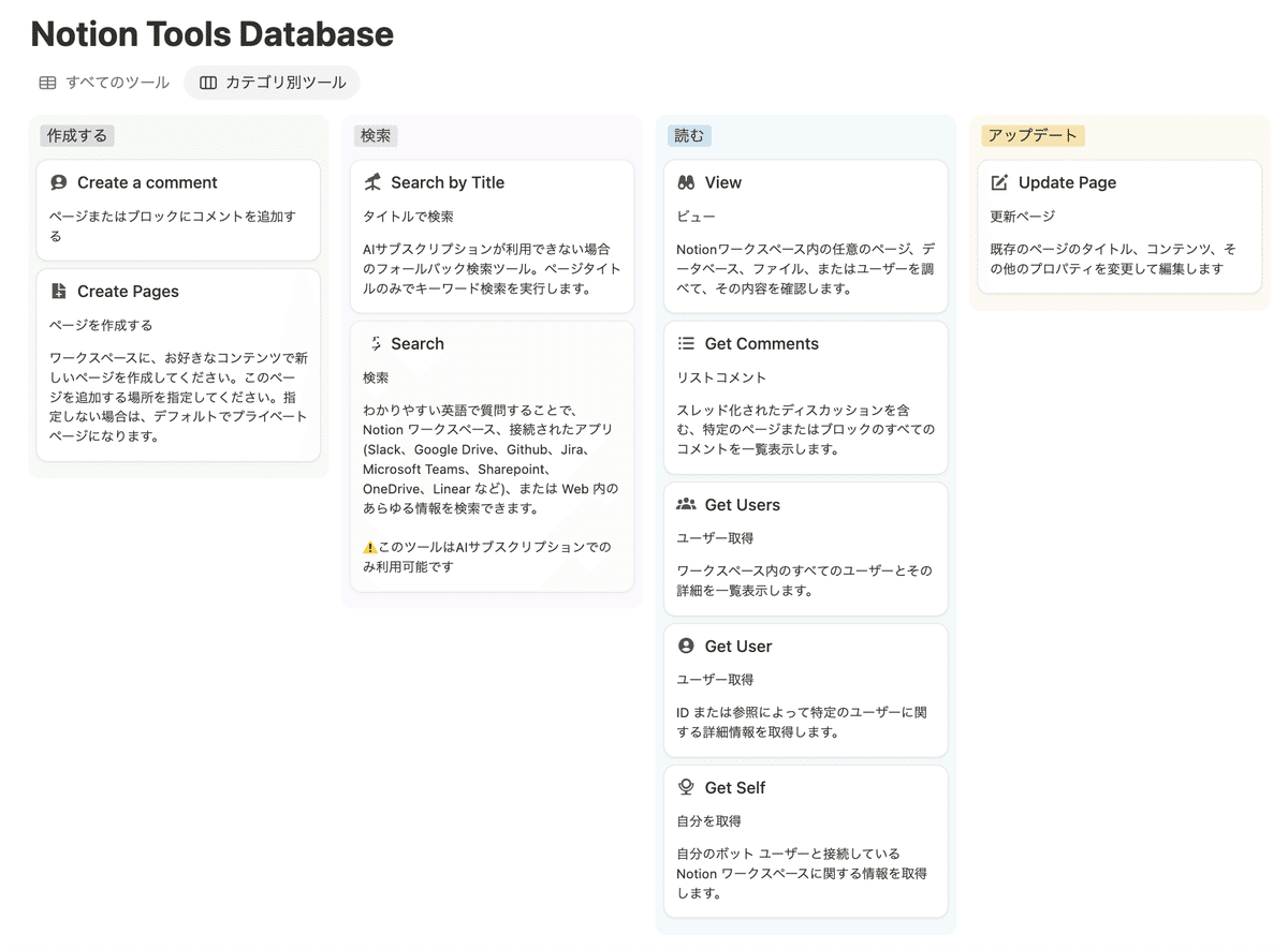 公式ページに掲載されているNotion MCPの機能はこちらです。