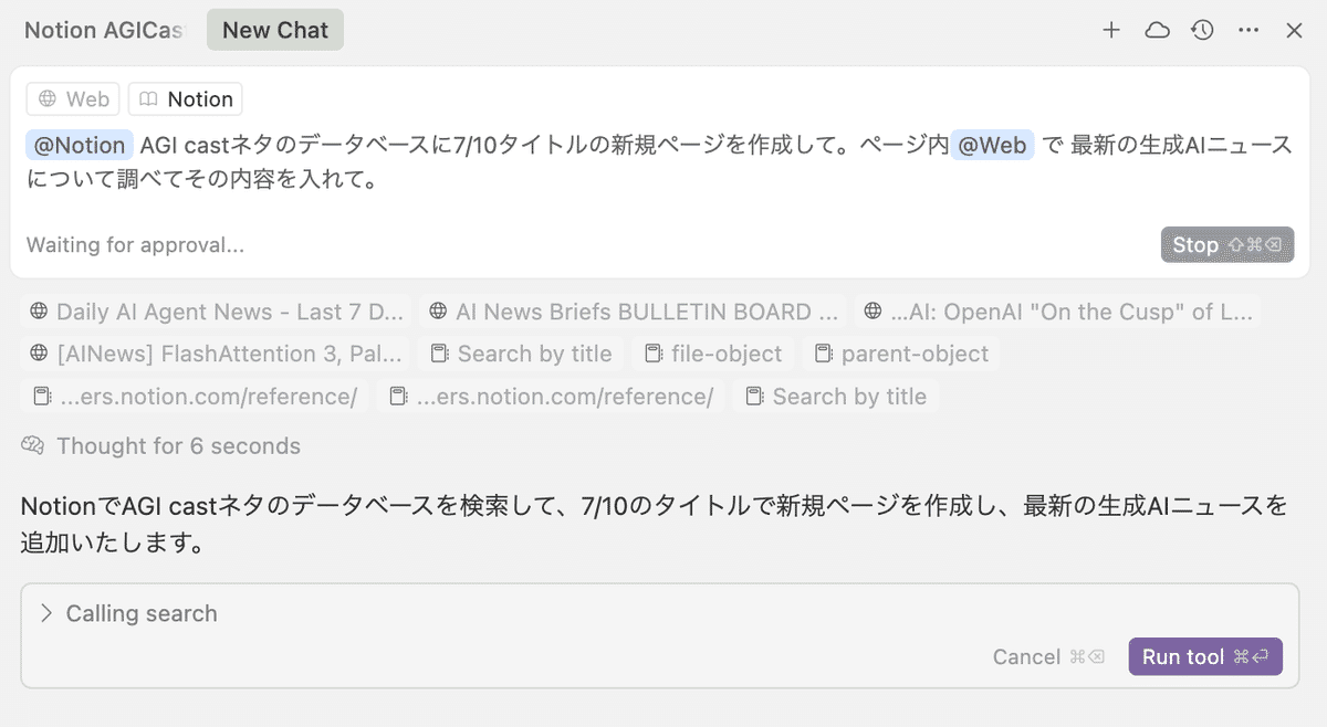 以下のように指示すると、Notion操作を実行するための確認がでるので、「Run tool」を押して実行します。