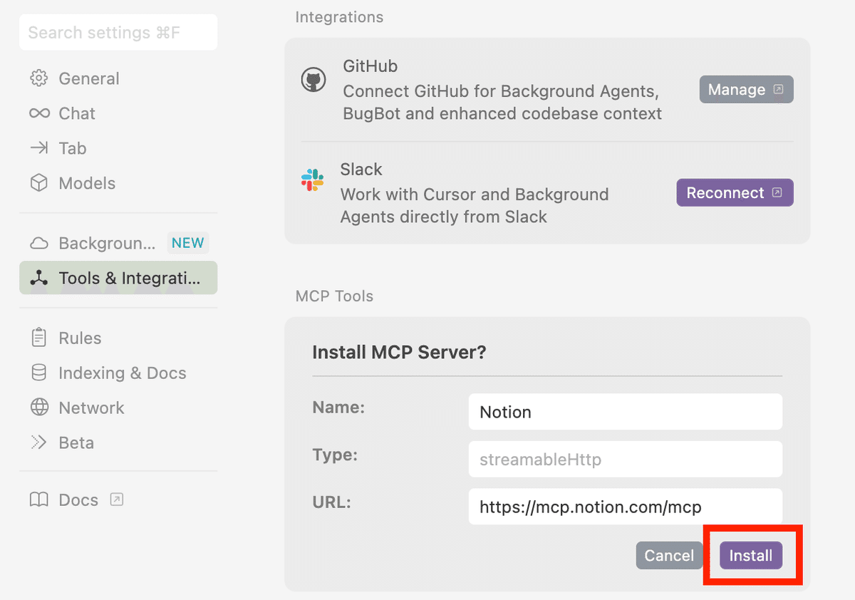 Cusor SettingのTools&Integrationsが開きます。Install MCP Sever?で、「Install」を押してインストールします。