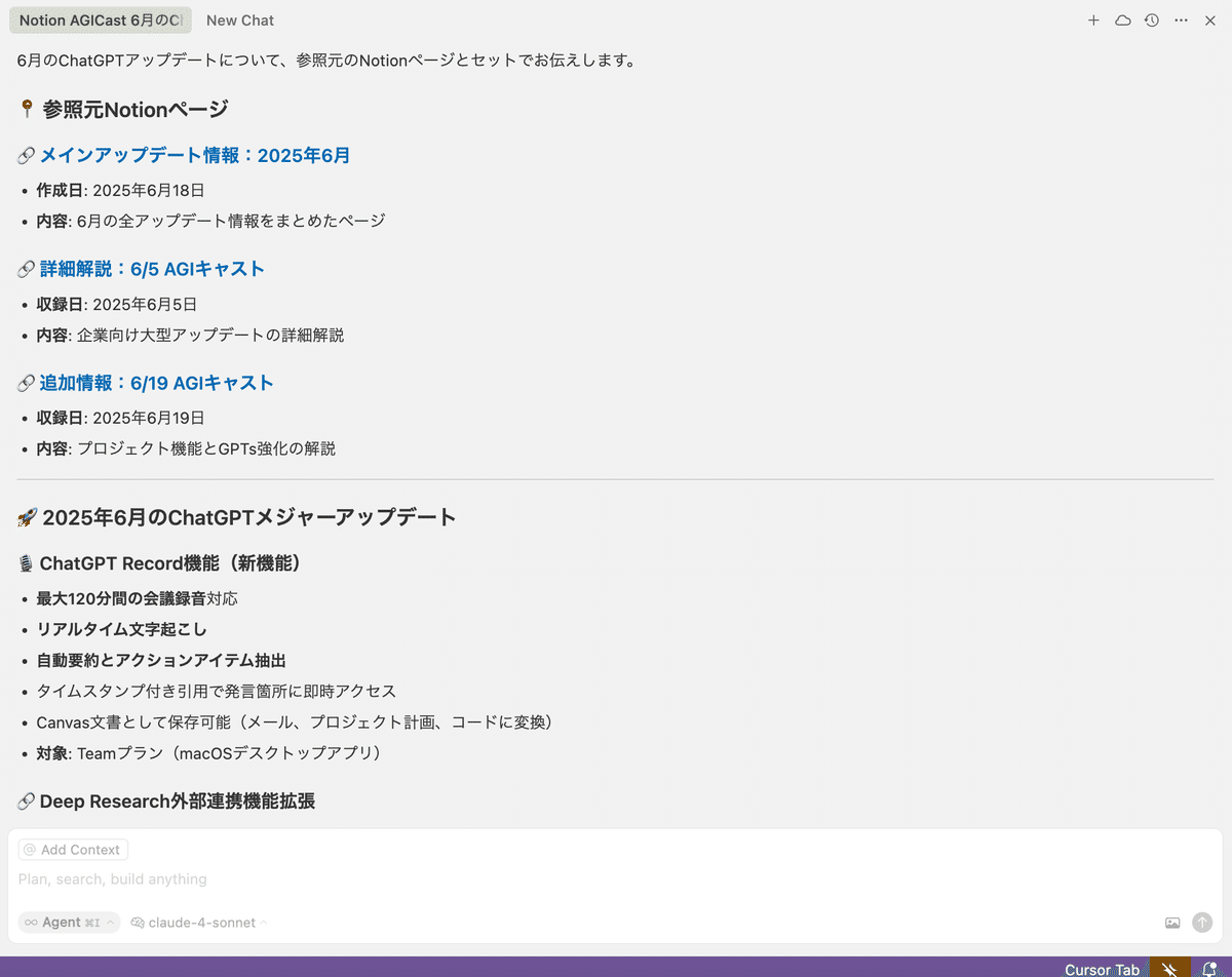 参照したNotionページとセットで出力してと指示することで、このように参照ページリンクも出力してくれます。