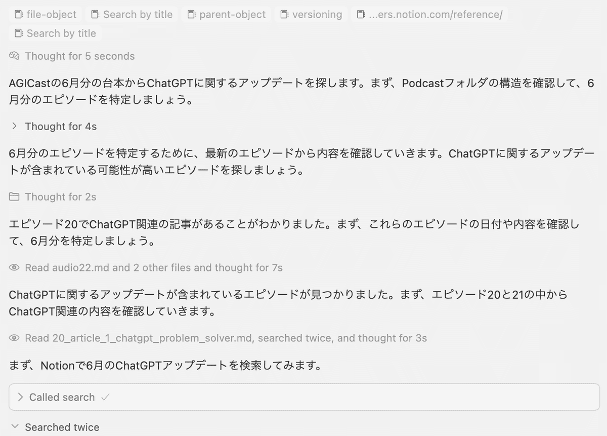 複数のNotion内ページを見て、情報を収集してくれています。