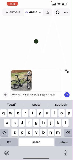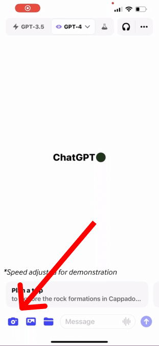 2 . 左下のカメラのマークからChatGPTに提供したい画像を撮影、または隣の写真のマークをクリックして、カメラロールから画像を選択することもできます。