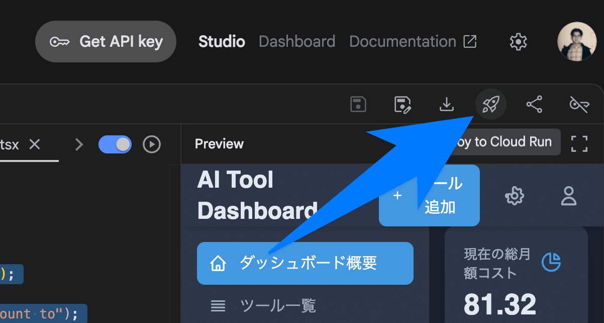 React(TypeScript)ベースのWebフロントエンドコードを生成します。生成されたコードは閲覧・直接編集可能で、AIとの対話を通じて改良できます。コード生成にはClaude 3.7 Sonnetモデルを使用しています。Google AI Studio (Build機能):