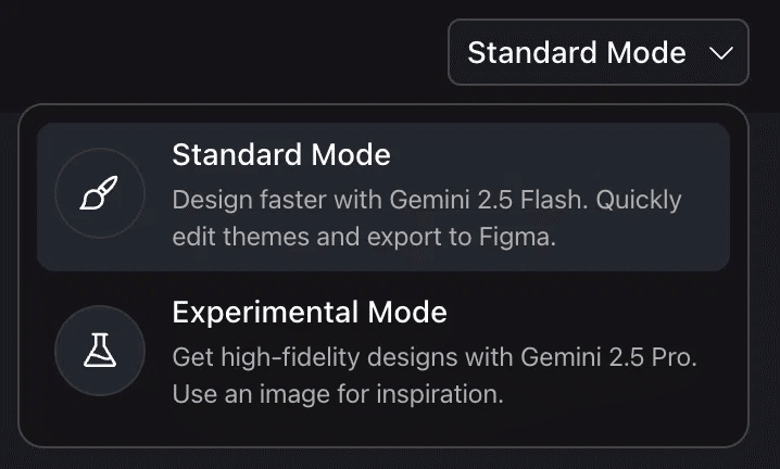 主に静的なHTMLを生成するデザイン特化型ツールです。Standard ModeはGemini 2.5 Flashを使用し、Experimental Modeではより高品質なUIを生成可能なGemini 2.5 Proを利用します。ただし、現時点でFigmaへのエクスポートはStandard Modeのみ対応しています。