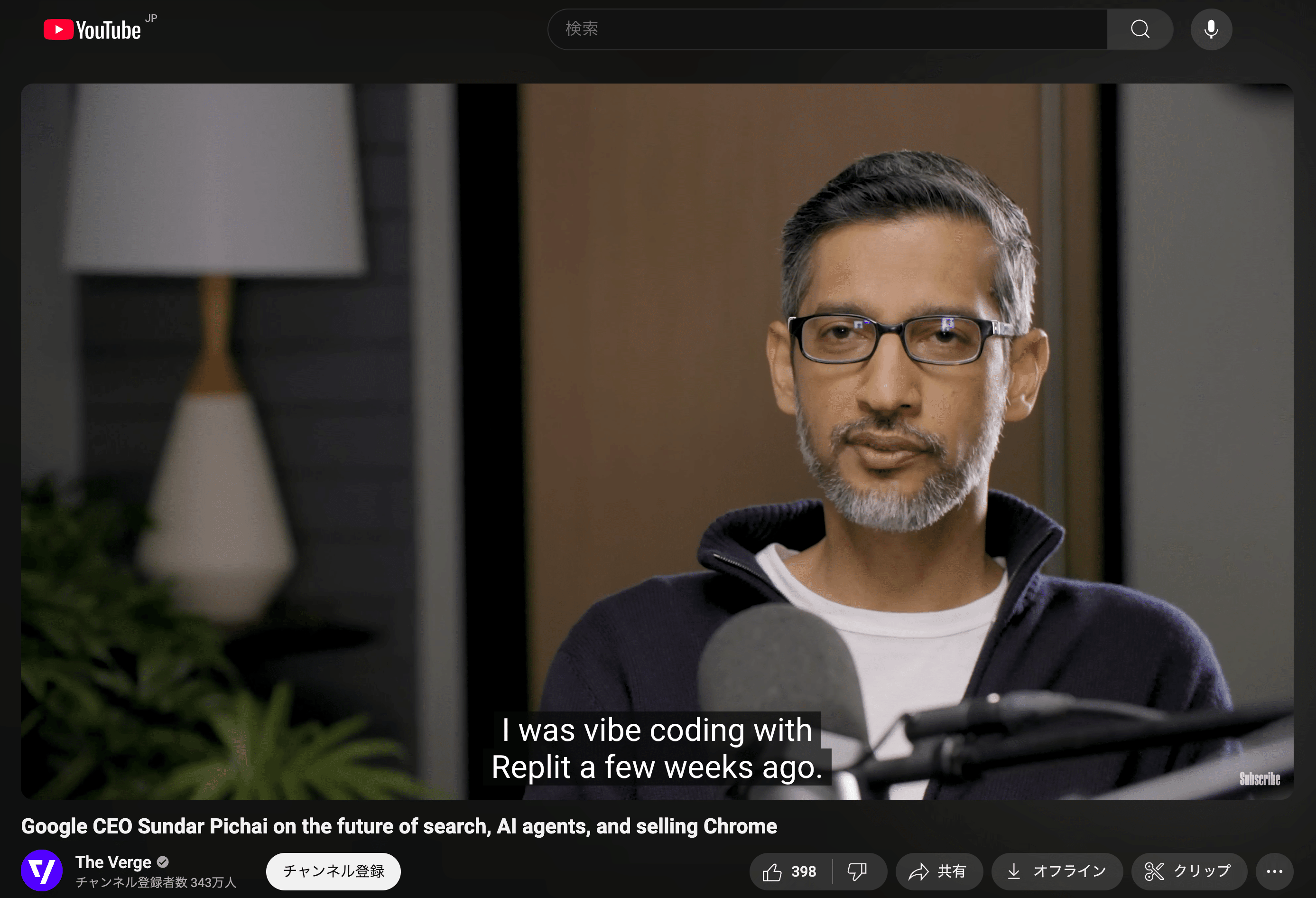 Google CEOのSundar Pichaiも「これから人々はAIを使ったアプリを簡単に作れるようになり、バイブコーディングのような方法でそれを行うだろう」と発言。このバイブでコーディングする波は急速に高まっています。