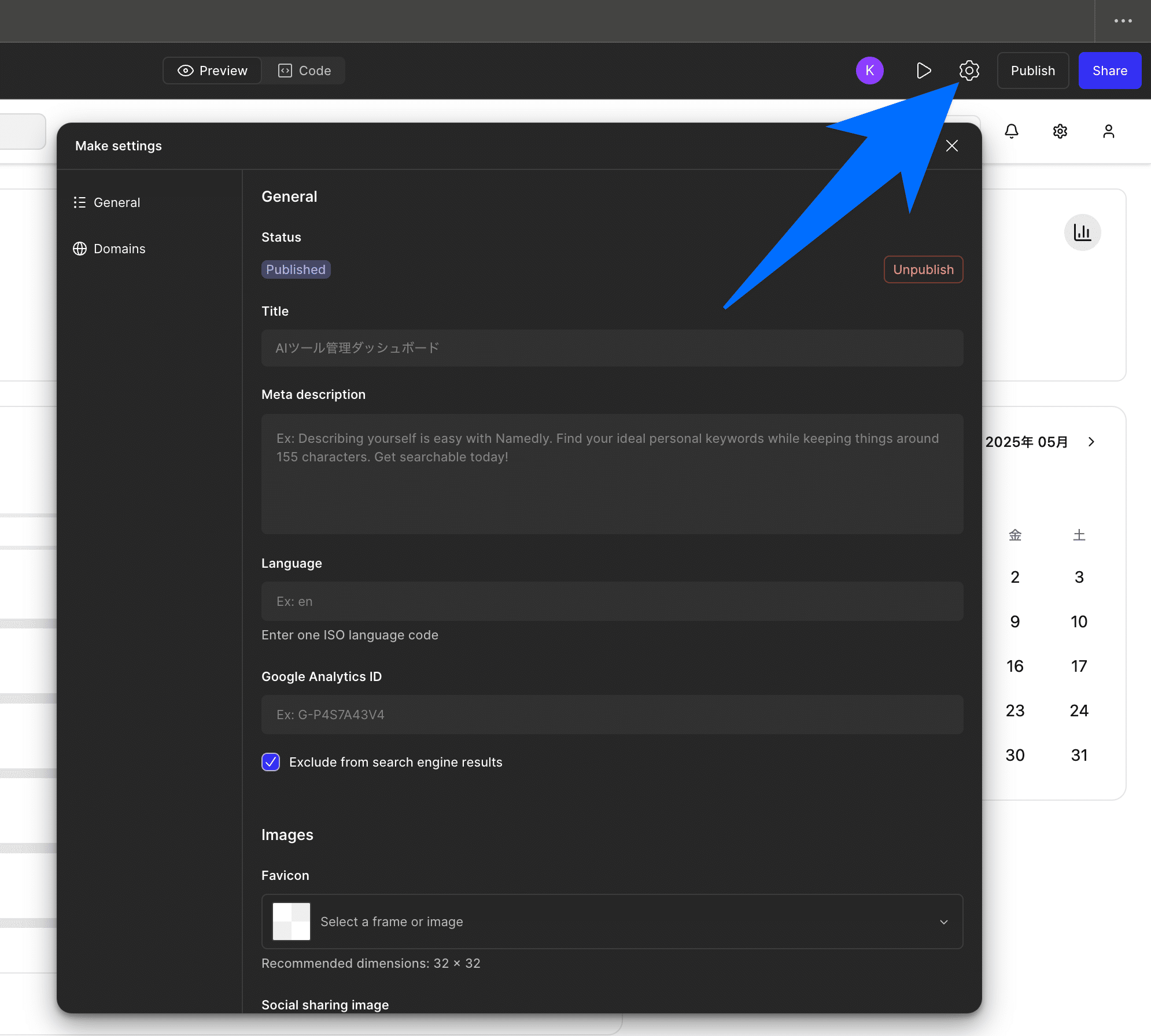 さらに、右上の設定アイコンから、公開サイトのタイトル、メタディスクリプション、言語、ファビコン、OGP画像、Google Analytics IDの設定や、検索エンジンへのインデックス除外、カスタムコード(head/body)の挿入といった詳細な設定も可能。