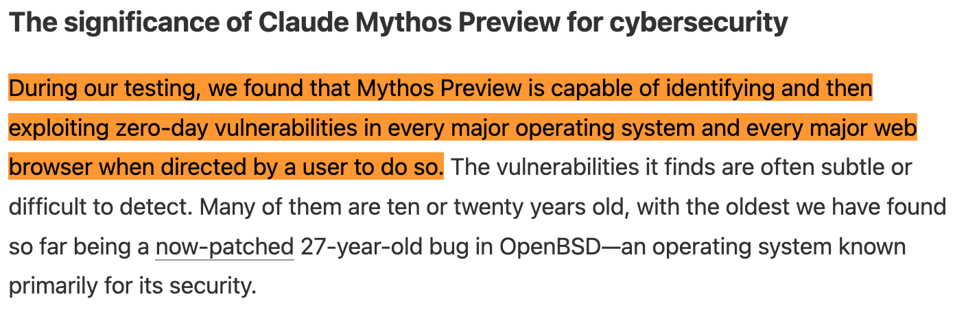 これは前々から言われていたことではありますが、Mythos Previewがすべての主要OS・ブラウザでゼロデイを発見・exploit化できると公式に述べられている以上、同等能力のモデルが広まった場合、企業が依存しているソフトウェアの安全前提は再検討を迫られます。